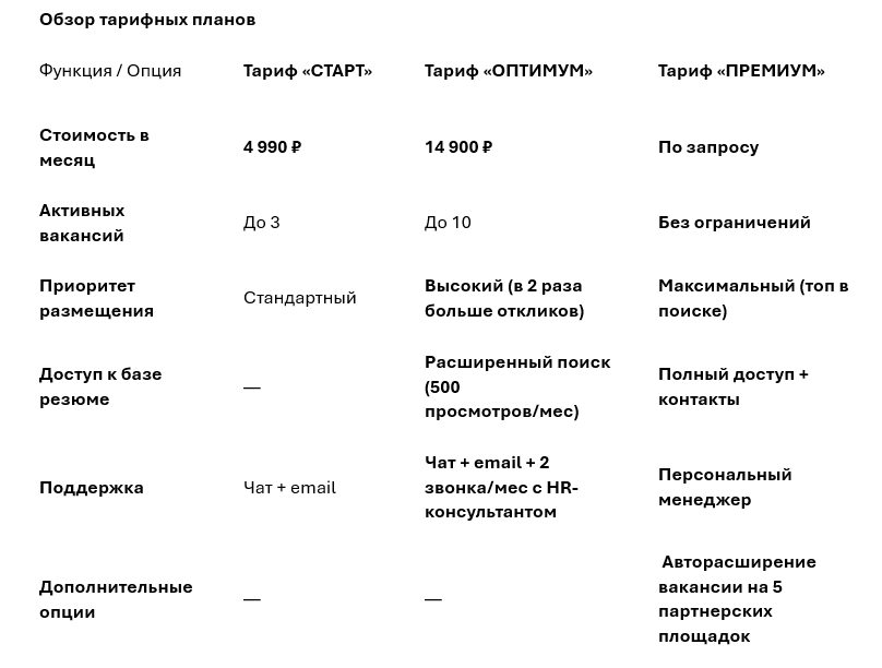 О. Мы предлагаем гибкие аддоны: пакет дополнительных вакансий, увеличение лимитов на просмотр резюме. Свяжитесь с нами для расчета.